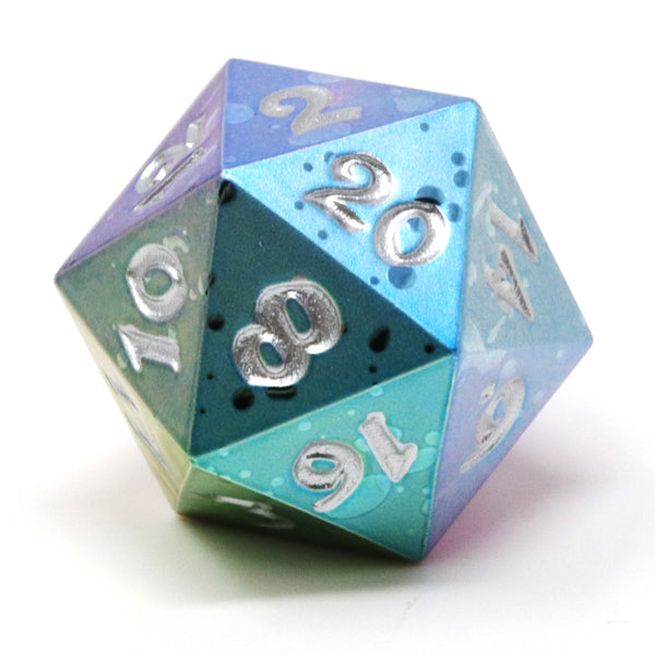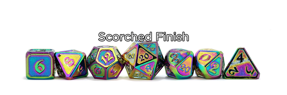 Scorched Rainbow sets are solid die-cast zinc, plated in chrome, then heat anodized with a torch to get a beautiful, colorful finish. Each die will be one-of-a-kind -- bands of color or bright spots of color are normal and expected.