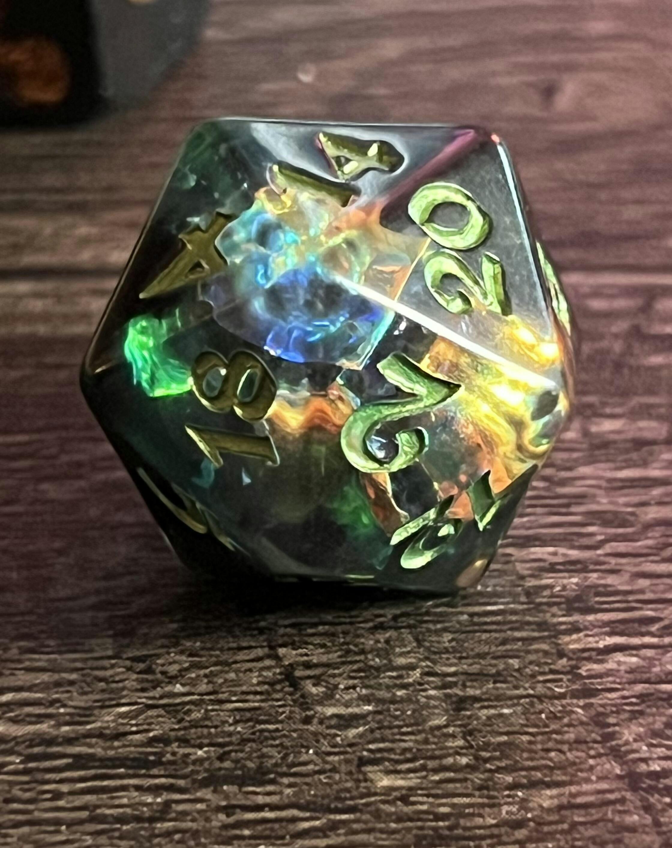 Omens of dark entities stalk the halls of Castle Die Hard. These shadowy dice feature ominous black and green swirls with reflective flakes throughout. The matching green ink aids the dark aesthetics of the dice, making them perfect for warlocks, sorcerers, or any other adventurer who’s made dark deals.