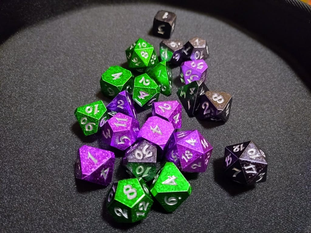 Powerful metallurgy was required to craft these great relics. These black dice may look like some fantastical and mythical alloy, but are light as a sunbeam dancing on the leaves. The silver ink provides a sharp, distinct contrast, making them particularly readable. These mythril treasures are the perfect addition to every dragon’s dice hoard, and they sure to roll true again and again.