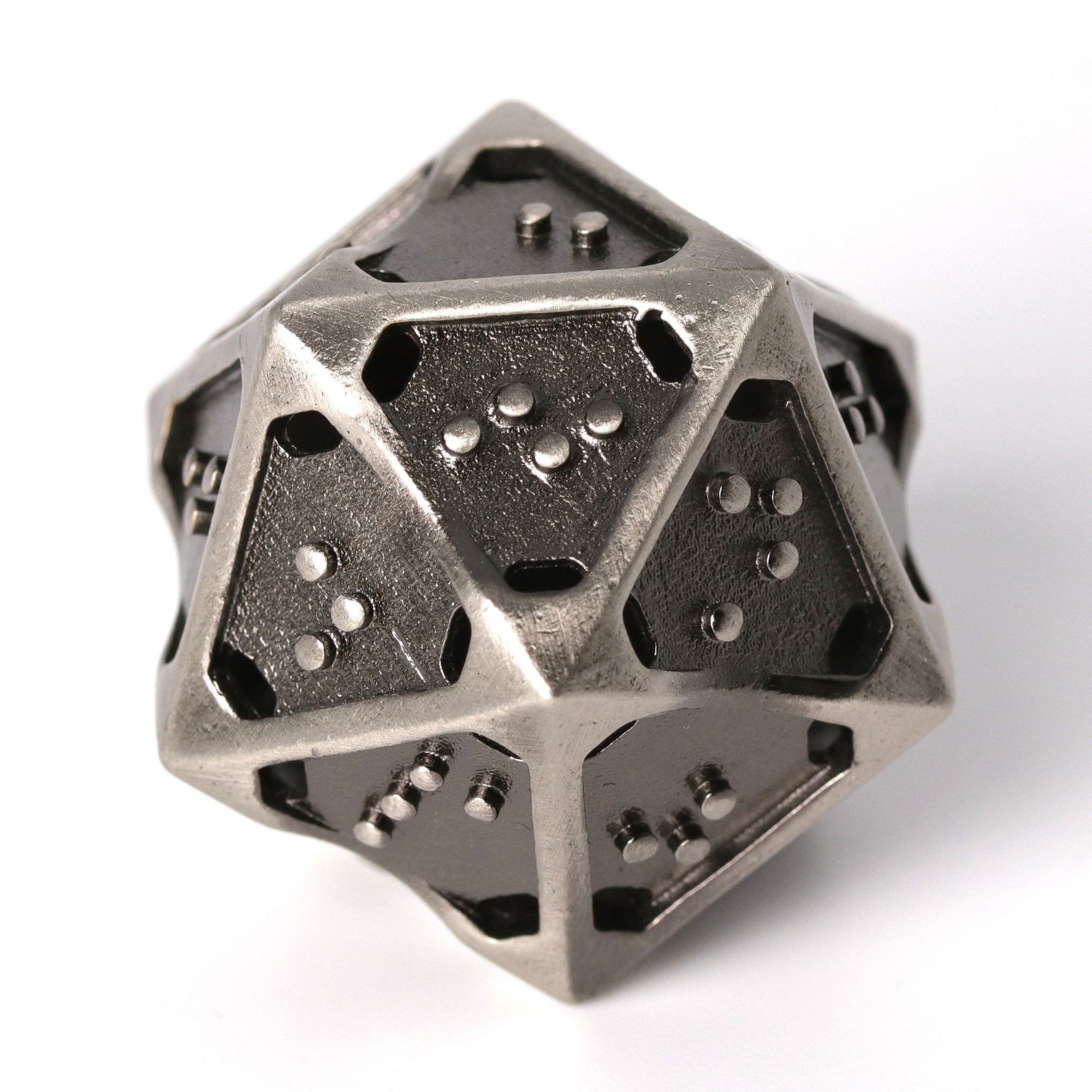 • Cast brass hollow metal dice with nickel plating in silver and dark antique recessed faces