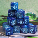 Positive counters are blue swirled dice with light blue inking