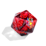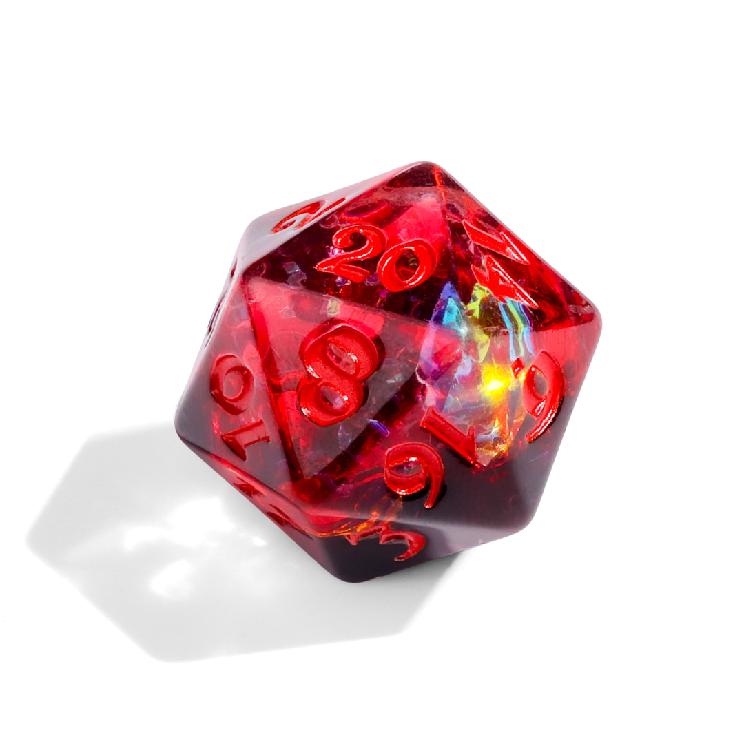 Omens of dark entities stalk the halls of Castle Die Hard. These shadowy dice feature ominous black and red swirls with reflective flakes throughout. The matching red ink aids the dark aesthetics of the dice, making them perfect for warlocks, sorcerers, or any other adventurer who’s made dark deals.