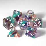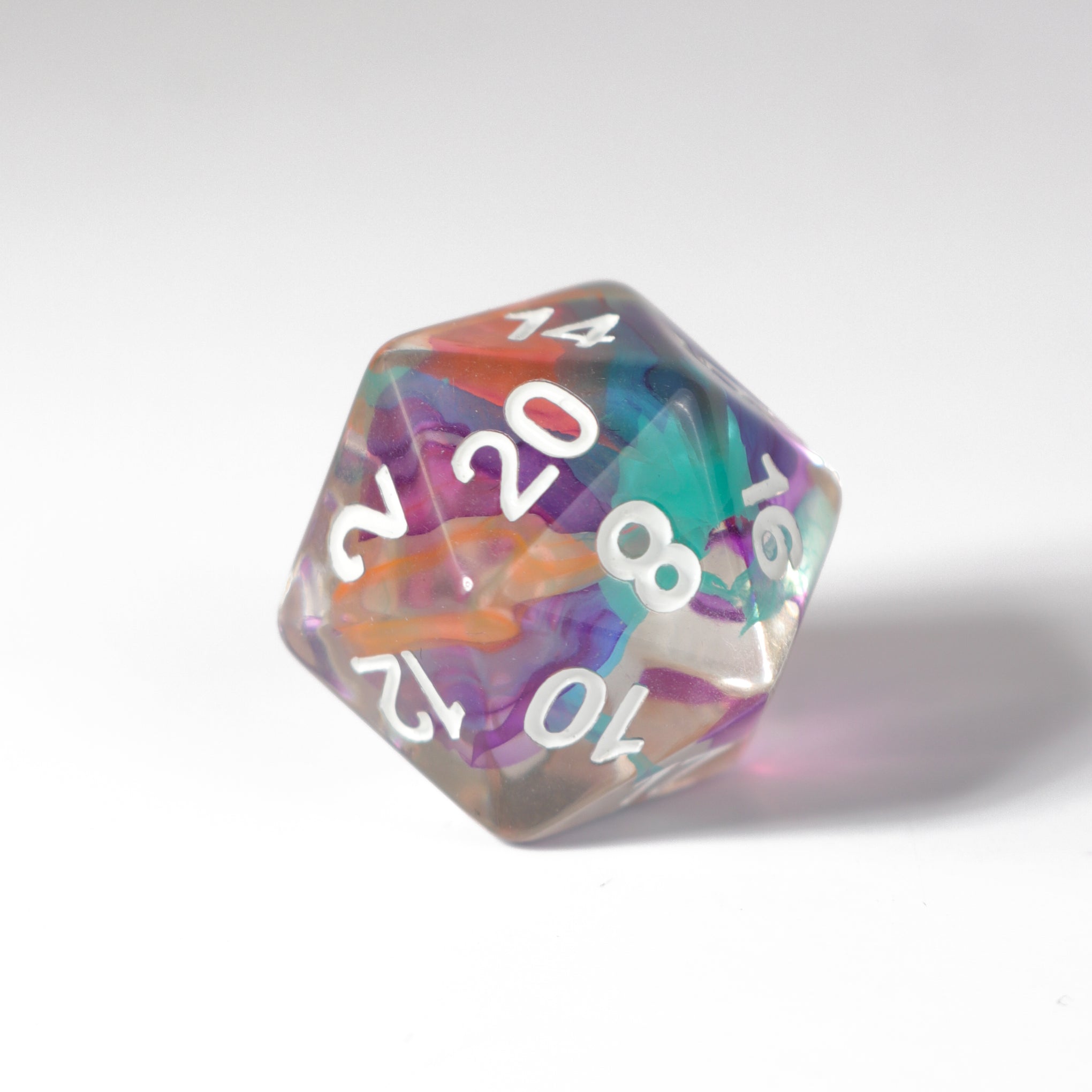 - Translucent dice with orange, cyan, and purple ink ribbons and white inking