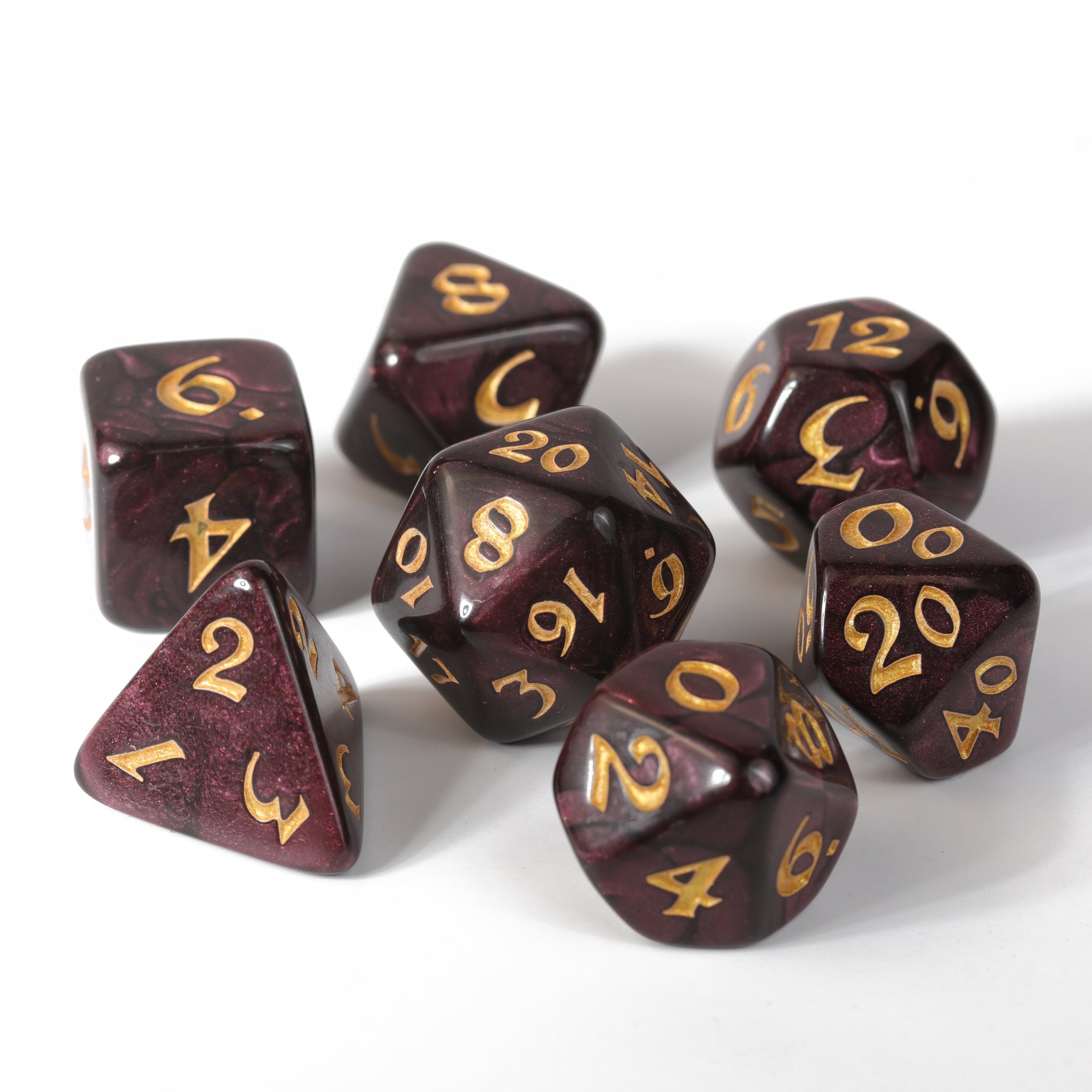 - Dark red/purple dice with gold sparkle swirls and gold inking