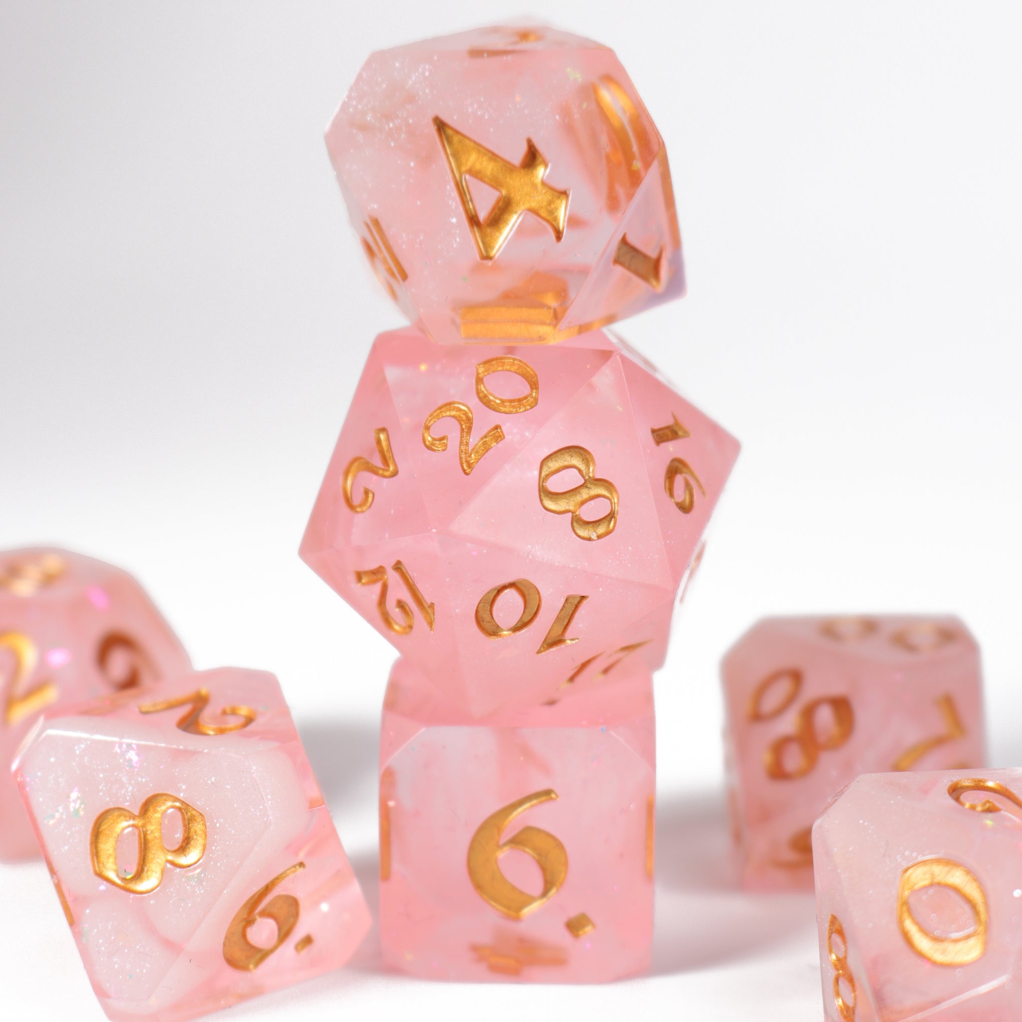 Some Transplanar adventurers have graced the halls of Castle Die Hard, and we're excited to announce our first sharp-edge resin dice! Each set was inspired by one of the four main characters; these were inspired by Sing! These translucent pink dice have glittery inclusions evocative of cherry blossoms and gold ink inspired by The Chosen one of the entire Transplanar campaign! These dice are the perfect addition to any adventurer's need for absolutely beautiful dice, so pick yours up today!